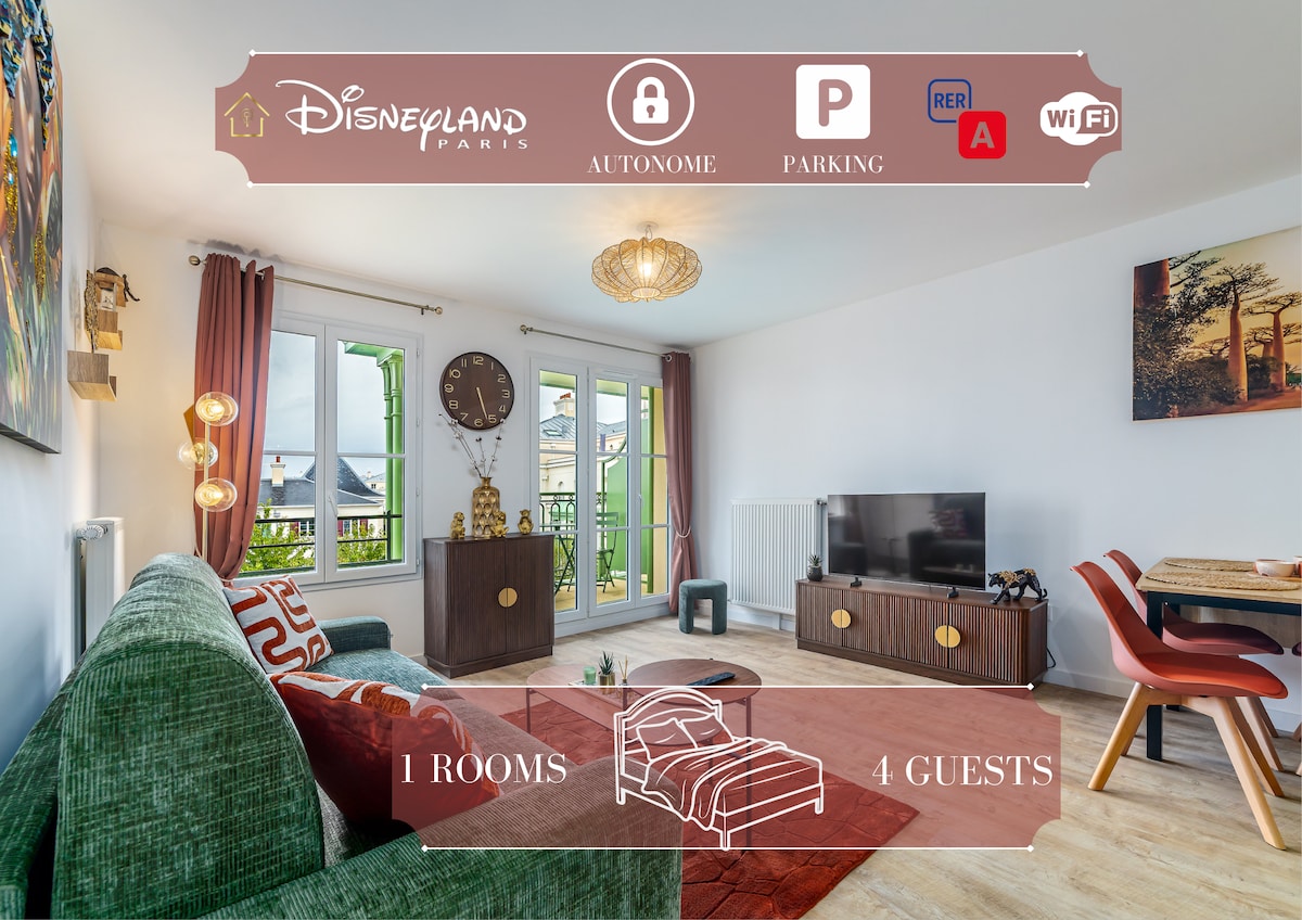 Bienvenue dans cet agréable appartement de 45m2, confortable et moderne, équipé pour 4 pers (+1 bébé) avec parking sécurisé gratuit dans une résidence de standing à quelques minutes de bus du parc Disneyland✨, de la vallée shopping 🛍️ et du centre commercial Val d’Europe. Idéalement situé, vous serez à 100 m de l’arrêt de bus, des restaurants et commerces (supermarché, boulangerie, pharmacie) Quartier calme et verdoyant. ⚠Terrasse indisponible du 4/11 a la fin avril pour travaux 🚧