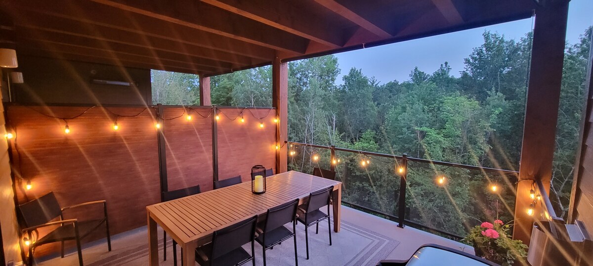 Our treehouse is a haven of well-being, peace, and elegance. In our stunning modern treehouse we have brought relaxation to a whole new level. Surrounded amongst us is nothing but woods & wildlife. An experience not to be missed. Put your favorite movie on the projector, get Zen in the cozy sun room, jam out to music on the record player, or grab a towel, and head for the custom cedar hot tub. It is time to create core memories that will never be forgotten. Welcome to a little slice of heaven.