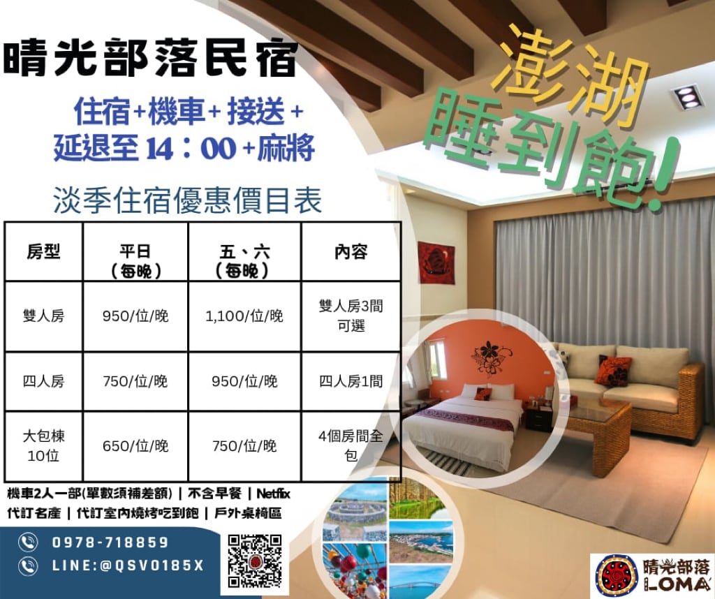 2025淡季優惠價出爐,封面照片有詳細價目表 11/1~2026/3/31日止 🉐機車(兩人一台) 🉐機場來回接送 🉐麻將桌 🉐網路電視 🔸🔸🔸🔸🔸🔸🔸🔸🔸🔸🔸🔸🔸🔸🔸🔸🔸 🔸🔸🔸🔸🔸🔸🔸🔸🔸🔸🔸🔸🔸🔸🔸🔸🔸 訂房前如想詢問細節請用Line ✅ID:@qsv0185x ———————————————————— 合法民宿編號:246 ✅也可至FB搜尋🔍 「澎湖晴光部落loma’民宿」粉絲頁並私訊我們 可詢問澎湖機票、船票、行程、租車等等.... 地理位置: 1886晴光部落位於澎湖本島南邊的「鎖港里」,大約在機場與市區中間,附近多沙灘景點,距離美麗的『山水沙灘』只要3分鐘車程,交通可說是相當便利 機場(碼頭)來回接送 精緻西式早餐及飲料