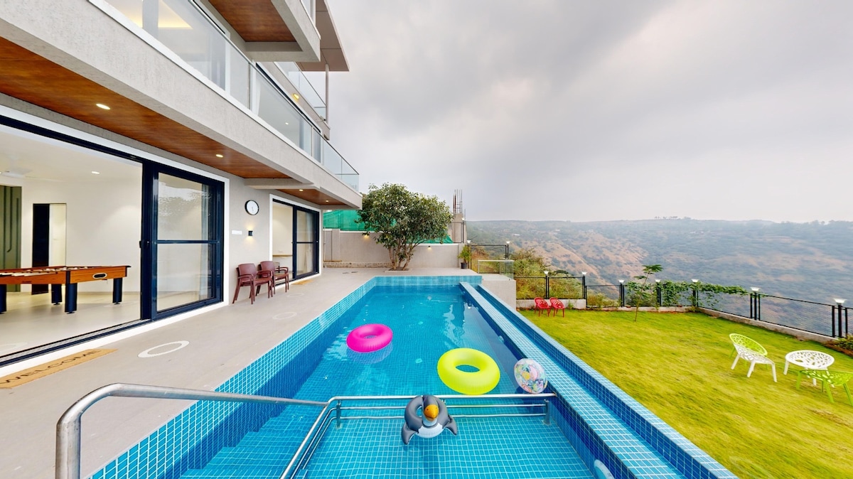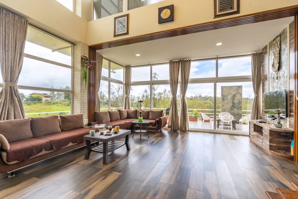 Luxury 6BHK villa with mountain views, fresh air, and a private pool — perfect for family getaways or hosting events. Features spacious lounges, elegant bedrooms with balconies, a full kitchen, smart TVs, Wi-Fi, and daily housekeeping. Enjoy outdoor dining, lush gardens, and serene surroundings. Ideal for celebrations or peaceful escapes, just minutes from scenic trails and local attractions. A perfect blend of nature, comfort, and style.