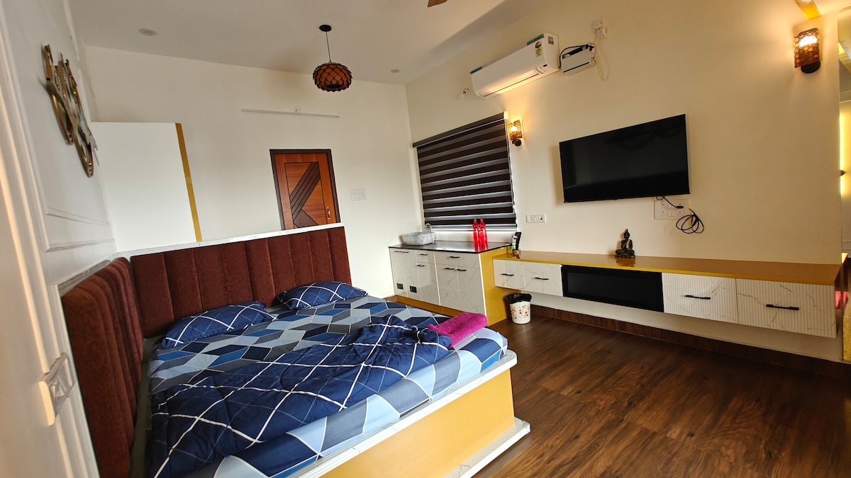Indian themed compact and cozy 1BHK is ideal for monthly or longer stays. -Couple friendly 🎥 A screen projector for a cinema-style viewing experience. A Sofa cum small bed to enhance your visual experience in living hall with AC 🌆 Located on the 10th floor of a secure gated high-rise near Maduravoyal Flyover. 🌇 A west-facing balcony with stunning sunset views (perfect for your evening coffee!) 🐾 Pet-friendly & family-friendly setup