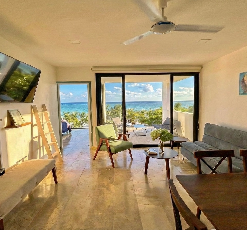 Ancla Mahahual presents Casa Caribe Ocean front condo with swimming pool! We offer 2 bedrooms, 2 bathrooms, living room, dining room and kitchen. The sofa makes into a bed for extra sleeping space if needed. Great location! Within walking distance to all the best restaurants! We offer STARLINK high speed internet. ***We do not provide beach towels***