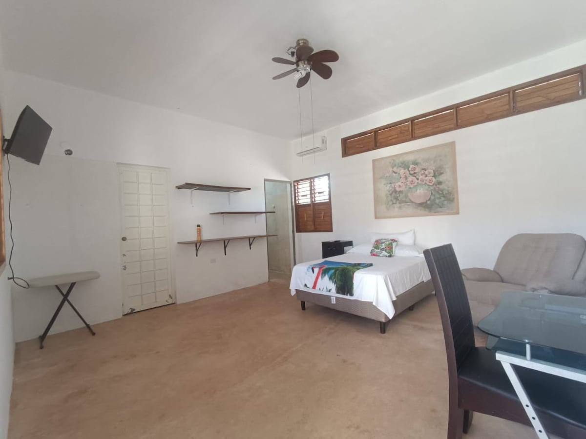 The house features a primary bedroom with air conditioning and a full bathroom, as well as an elegant independent studio with a double bed, air conditioning, and a private bathroom. The fully equipped kitchen flows into a refined dining area and a cozy living space with a hammock and sofa bed. The property offers private front and rear patios, three bicycles to explore Mahahual freely, high-speed internet, and an exceptional location.