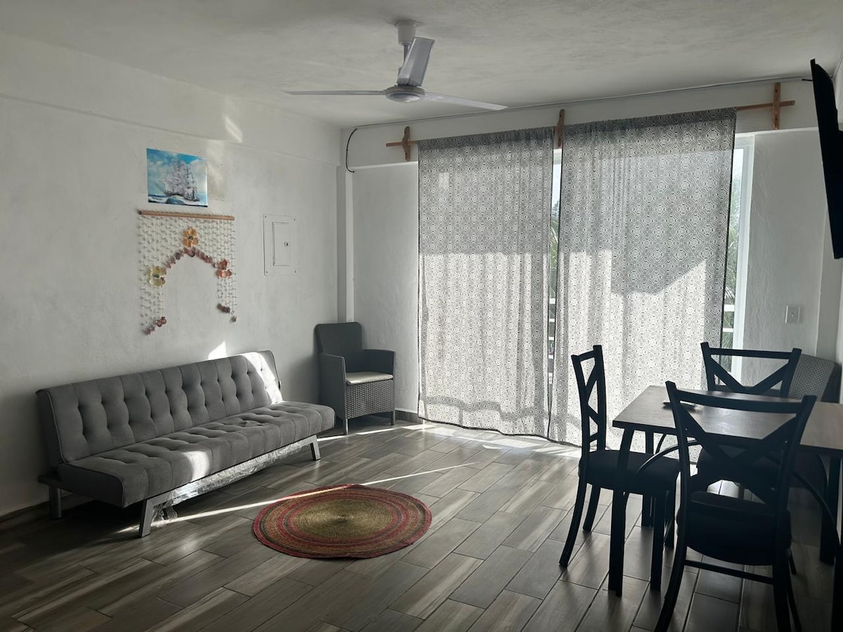 Departamento totalmente nuevo, con acabados de lujo y una espectacular vista al mar. 2 habitaciones, 2 baños completos, A/C , WIFI, cocina totalmente equipada, sala comedor abiertos, amplia terraza, alberca y playa con camastros Excelente ubicación. En el malecón de Mahahual. A unos pasos de los mejores restaurantes, centros de buceo, snorkel y clubs de playa. Aire acondicionado en todos los espacios, ventiladores de techo, 3 pantallas planas, TV x cable (posibilidad de aceptar mascotas*)