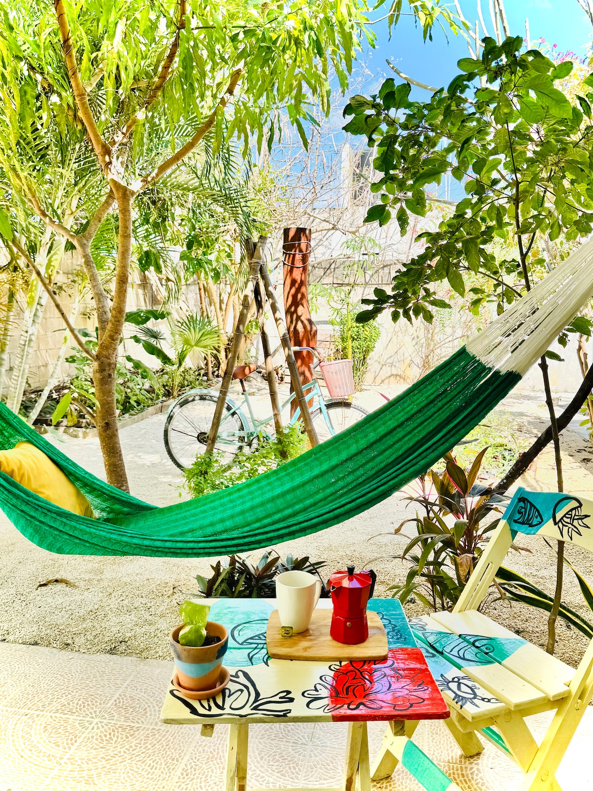 Disfruta Mahahual en este hermoso espacio con vista al Jardín, ya sea en pareja o con amigos seguro te encantará. Tiene cocina completa al aire libre, hamaca para tu descanso y un pequeño huerto, si llegas en temporada y hay frutos puedes hacer uso de ello. La playa está a tan solo 5 minutos en bicicleta las cuales te proporcionamos 🚲 , vivirás la experiencia completa como todo un local! Cercano al lugar hay bares, restaurantes y pequeños supermercados, seguro disfrutarás sin gastar de más