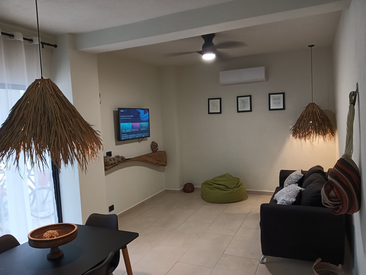 Beatiful, brand new department formed by 2 connecting studios. It has 2 bedrooms with queen size bed to host up to 4 guests. It also has 2 bathrooms, air conditioning and ceiling fans and kitchenette, equipped with microwave oven, induction stove, sink, fridge, coffee maker and cookware. The department is part of the condo called "Casa del Viento" and offers cozy common areas, garden and rooftop terrace with swimming pool and sea views, to chill and share experiences with other guests.