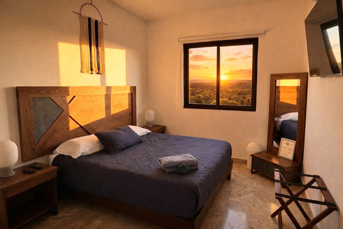 Villa Ek Nah is an incredible beachfront penthouse in Mahahual. Privileged location: Villa Ek Nah is located right in front of the sea, which means that you will be able to wake up with spectacular views and enjoy the sea breeze throughout the day. Access to exclusive facilities: As a guest of our penthouse, in addition to having access to the complex's facilities and direct access to the ocean, you will also have access to the private roof top with Jacuzzi, palapa and barbecue.