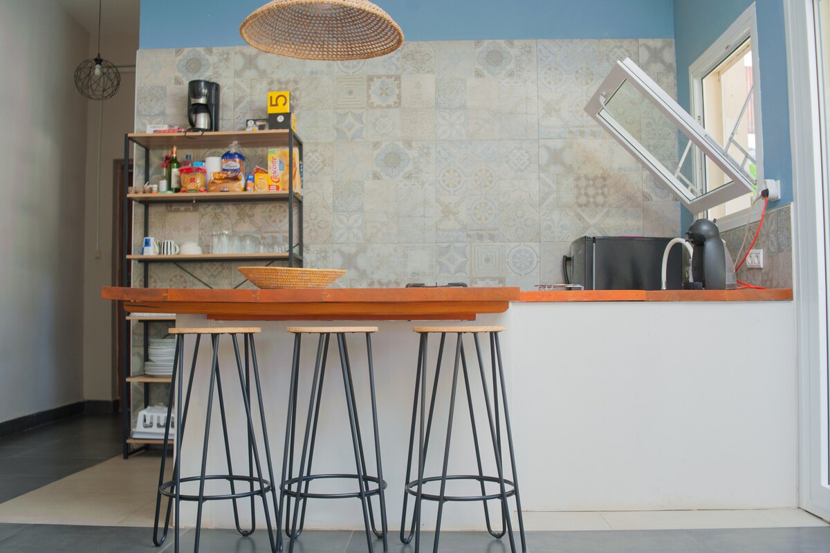 Magnifique studio au 1er étage. Vous bénéficierez de tout le confort de l'appartement dans le tarif indiqué : - cuisine équipée (frigo S, induction, gaz en cas de coupure d'électricité malheureusement fréquente sur l'île), - climatiseur, - TV Canal+, - eau chaude, - accès à internet, - accès à la piscine - et ménage durant le séjour. Le matelas est de marque VITAFOAM en qualité premium, gage d'une nuit réparatrice et paisible. Fenêtre de marque française à double vitrage.