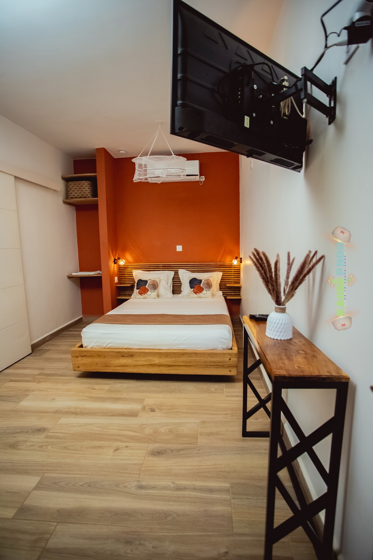 Magnifique studio au 1er étage. Vous bénéficierez de tout le confort de l'appartement dans le tarif indiqué : - cuisine équipée (frigo S, induction, gaz en cas de coupure d'électricité malheureusement fréquente sur l'île), - climatiseur, - TV Canal+, - eau chaude, - accès à internet, - accès à la piscine - et ménage durant le séjour. Le matelas est de marque VITAFOAM en qualité premium, gage d'une nuit réparatrice et paisible. Fenêtre de marque française à double vitrage.