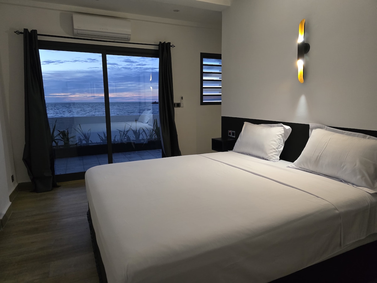 Appartement face à la mer, rez de chaussée. Appartement équipé ayant 1 chambre parentale et 1 chambre enfant, pouvant accueillir jusqu’à 5 personnes. 1 wc, 3 lits, 1 douche. Piscine gratuite, chalet privé sur la plage, trampoline pour les plus petits, rooftop avec vue sur l’océan, starlink à disposition, cuisine. Femme de ménage & cuisinière en option (ménage, lessive, repas sur demande); Parking privé et gardien sur place