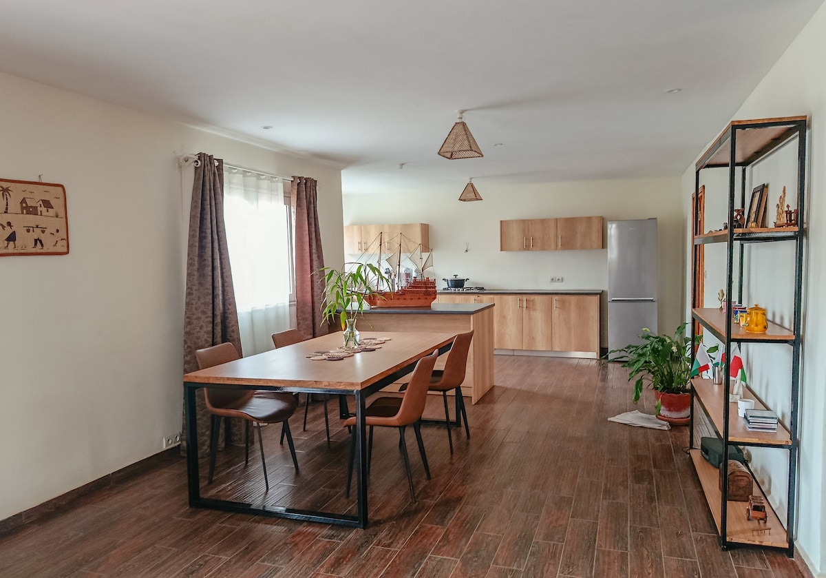160 sm Town house, located in Antananarivo, 10' walk from city centre hub, and shopping, as well as historical sites. easy taxi nearby. Ground floor(80m2) : entry serves a living-dining area, a private study room, a fully equiped kitchen. A garage, a landscaped outdoor terrasse. First floor(80m2): 3 bedrooms, with ensuite bathroom, and WC. Beautiful interiors bathed with light: All rooms (but bureau) with panoramic vistas on antananarivo eastern hill side. security & cleaning weekly, wifi.