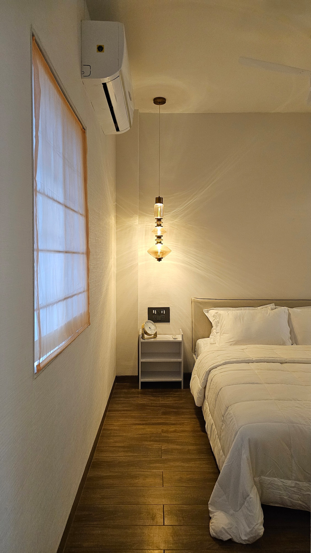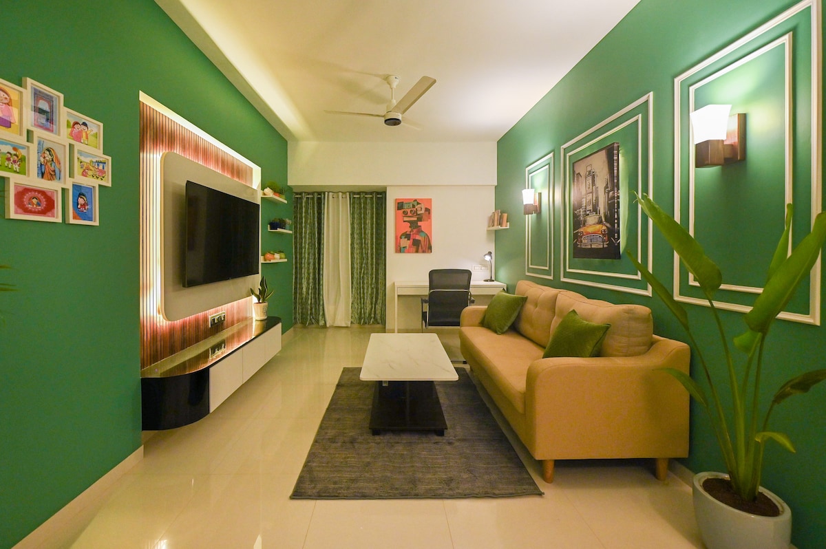 Welcome to our brand-new, spacious 2-BHK apartment, ideal for families and couples seeking comfort and convenience. The bedrooms have queen size beds with orthopedic mattresses and AC for a restful night's sleep. Relax in the large living room with a 43-inch Smart TV, lightning-fast WiFi and a dedicated dining area. Comes with two super clean bathrooms stocked with bath essentials. The fully equipped kitchen includes high-quality appliances and crockery for your culinary adventures!