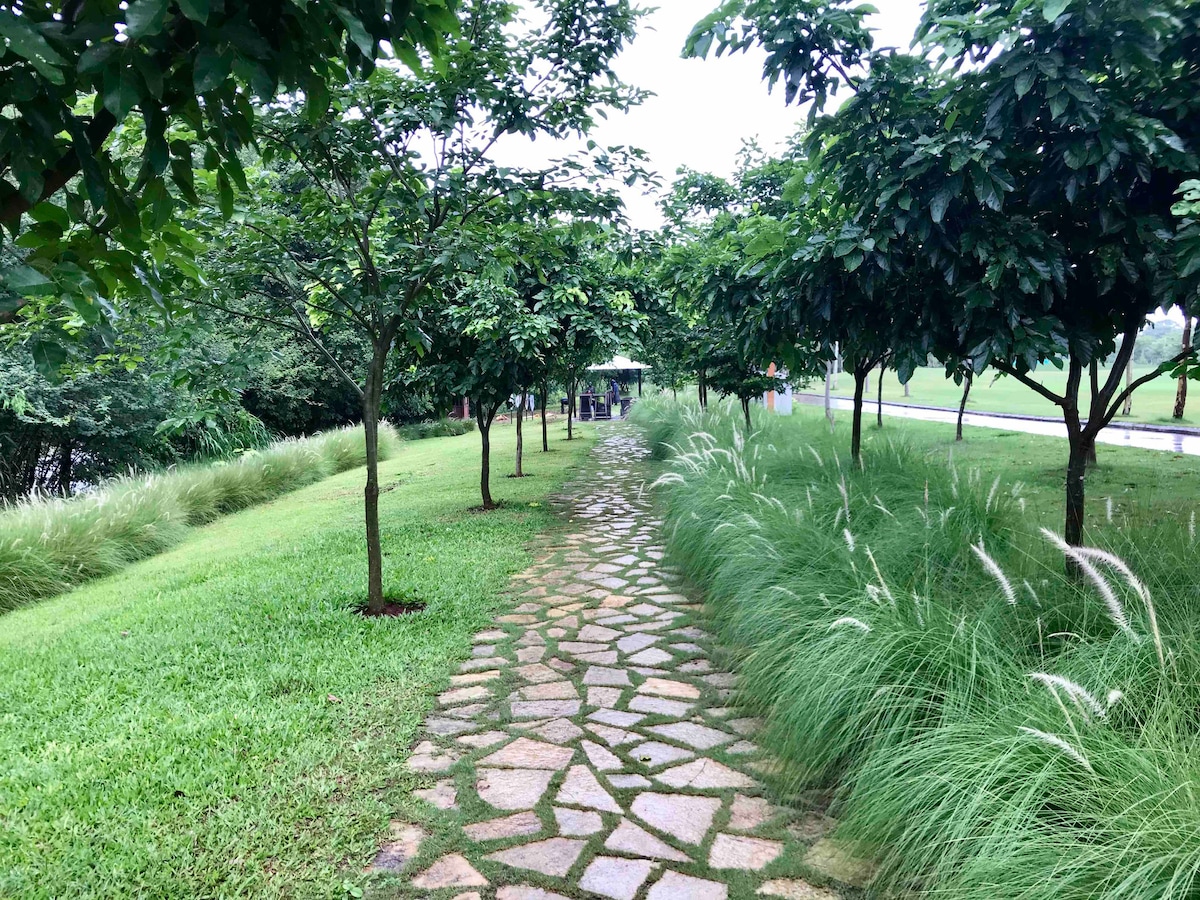 A cozy 1000 sqr ft. 1BHK The place is very quiet and calm. The house has following features : - Full kitchen with Gas stove, induction, microwave, refrigerator and utensils - Washing machine. Outdoor hanger to dry clothes. - Private garden - 32' TV, Fire TV with premium accounts for Netflix,Prime Video, SonyLiv, Zee5 - 24 Hour solar hot water - Inverter A/C - Wifi 100 mbps Tata fiber internet Enjoy the walk around the garden and the society.