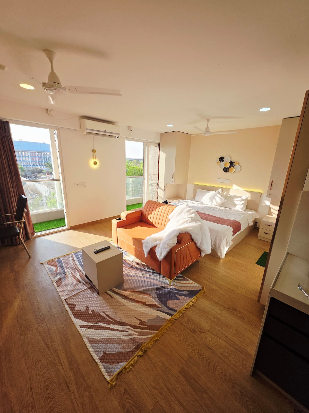 The Beige Cloud – A Luxurious 1BHK Penthouse Experience Above the City. Where luxury meets calm - rise above the noise and float in comfort. A meticulously designed penthouse that blends warm minimalism with high-end comfort. Set atop the city, this elegant retreat offers a soothing beige palette, immersive entertainment with 75 Inch TV, - perfect for couples, small families, or business travelers seeking serenity without compromise.