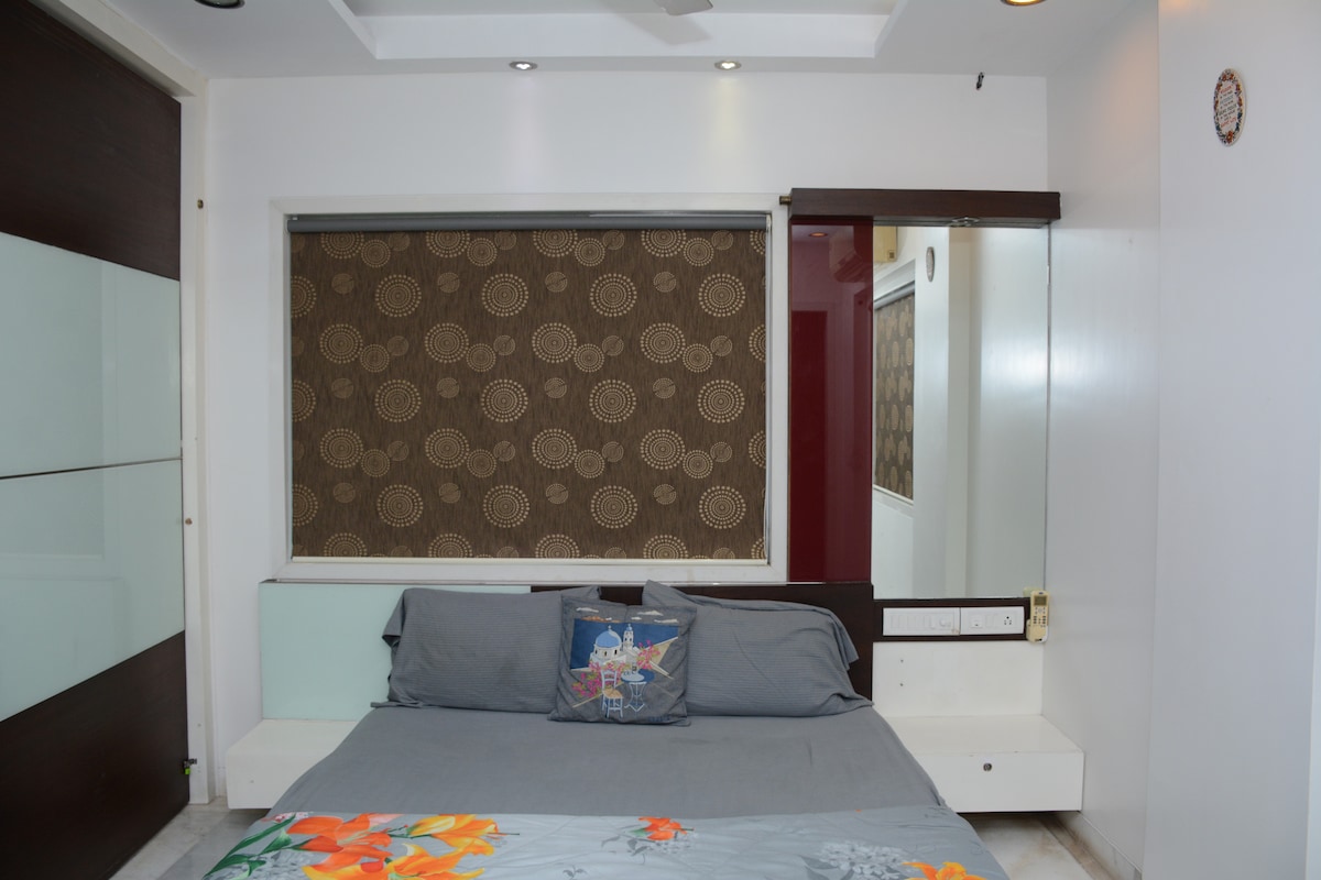 it's On First Floor(No Lift). Can Accommodate up to 5 person (2 Bed + 3 Extra Bed) 1.7KM From Bus Stand . 1.9 KM From Central Railway Station. 11 KM From Airport. 3.1 KM From Zero Miles (Centre of INDIA) Enjoy a stylish experience at this centrally-located place, with modular Kitchen and lovey hall with All cozy Lighting, extremely quiet Bedroom with Big mirror Dressing and big wardrobe, bed back id designed with Italian marble and you will get one Study unit for your work.
