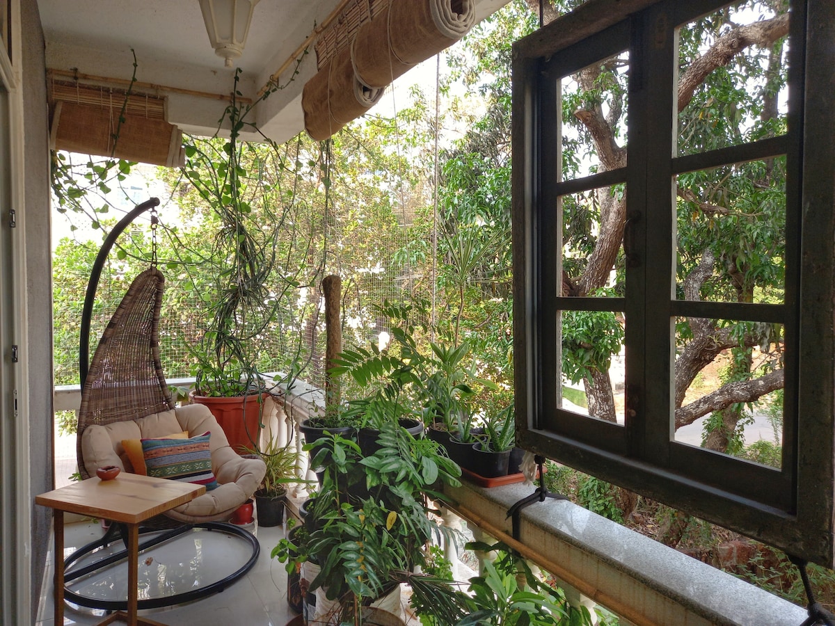 Imagine entering a modern & thoughtfully designed apartment with lush edible balcony gardens that you share with birds & squirrels. Located in Siolim Marna, this 1BHK is designed for couples, solo travelers & offbeat families on a short vacation, a longer workation or a peaceful retreat. We love all things design and DIY. Every piece of furniture has been upcycled and we've tried to think of everything you might need- wifi on backup, a bar, an equipped kitchen, a swing, books & art supplies!