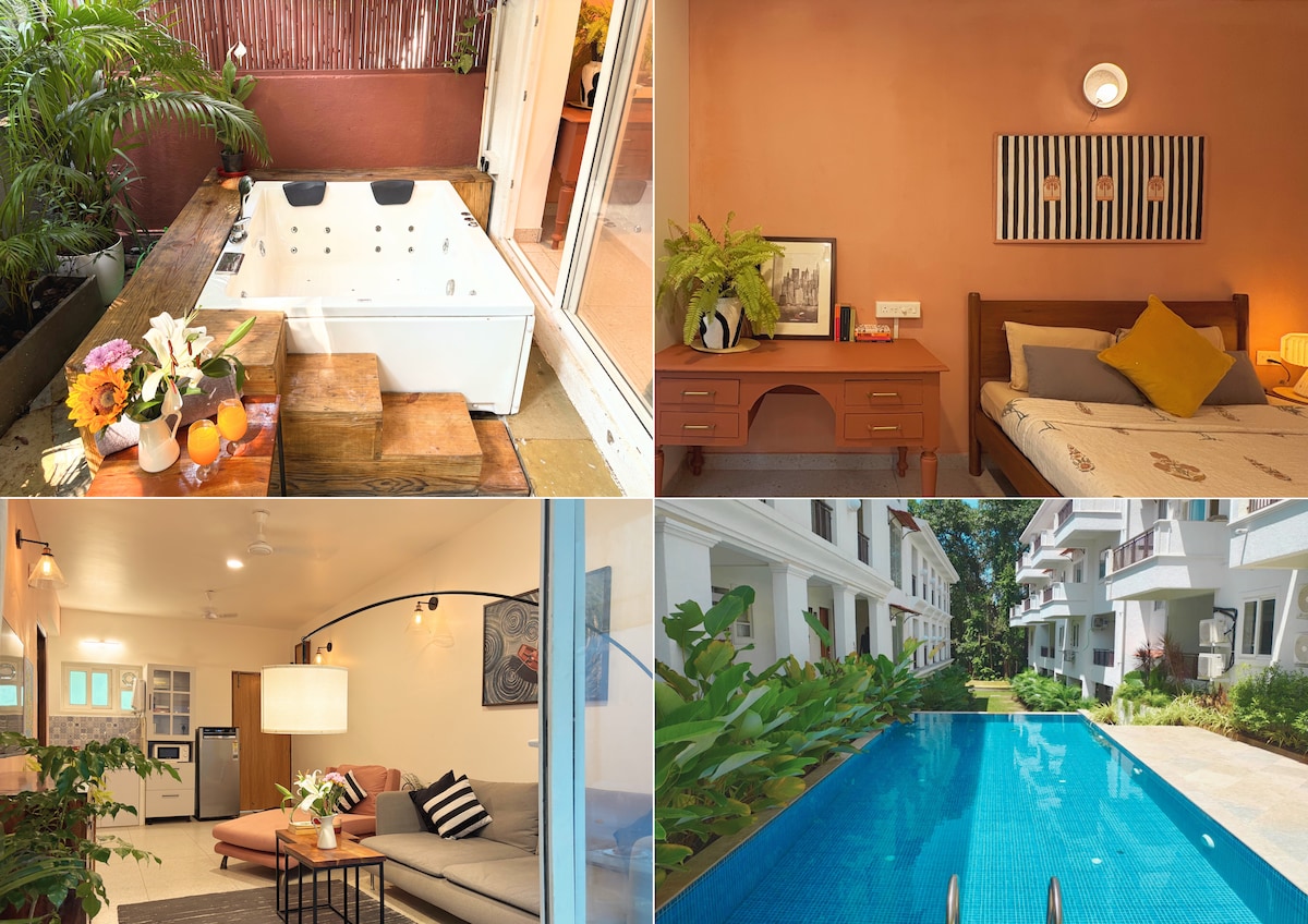 Welcome to Bohobnb, where comfort meets bohemian charm! Nestled in heart of Siolim, our 1-bedroom duplex apartment offers a unique stay with an attic and a private terrace. Surrounded by lush greenery, this home provides beautiful views that ensure peace and tranquility in a gated community with all the modern amenities including elevator, swimming pool, High-speed WiFi. Whether you're relaxing in the attic or soaking up the sun on the private terrace, every moment promises peace and comfort.