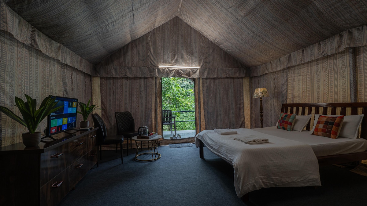 Indulge in our luxury glamping stay with a plush double bed, Bunk bed, AC, Wi-Fi, smart TV with OTT, and private bathroom. Unwind in nature without compromising on comfort. Take a refreshing dip in our swimming pool or enjoy delicious home-cooked meals by our in-house chef. Whether you’re stargazing or simply relaxing, our tent offers the perfect mix of serenity and modern living. A unique escape that feels like home with a touch of indulgence.