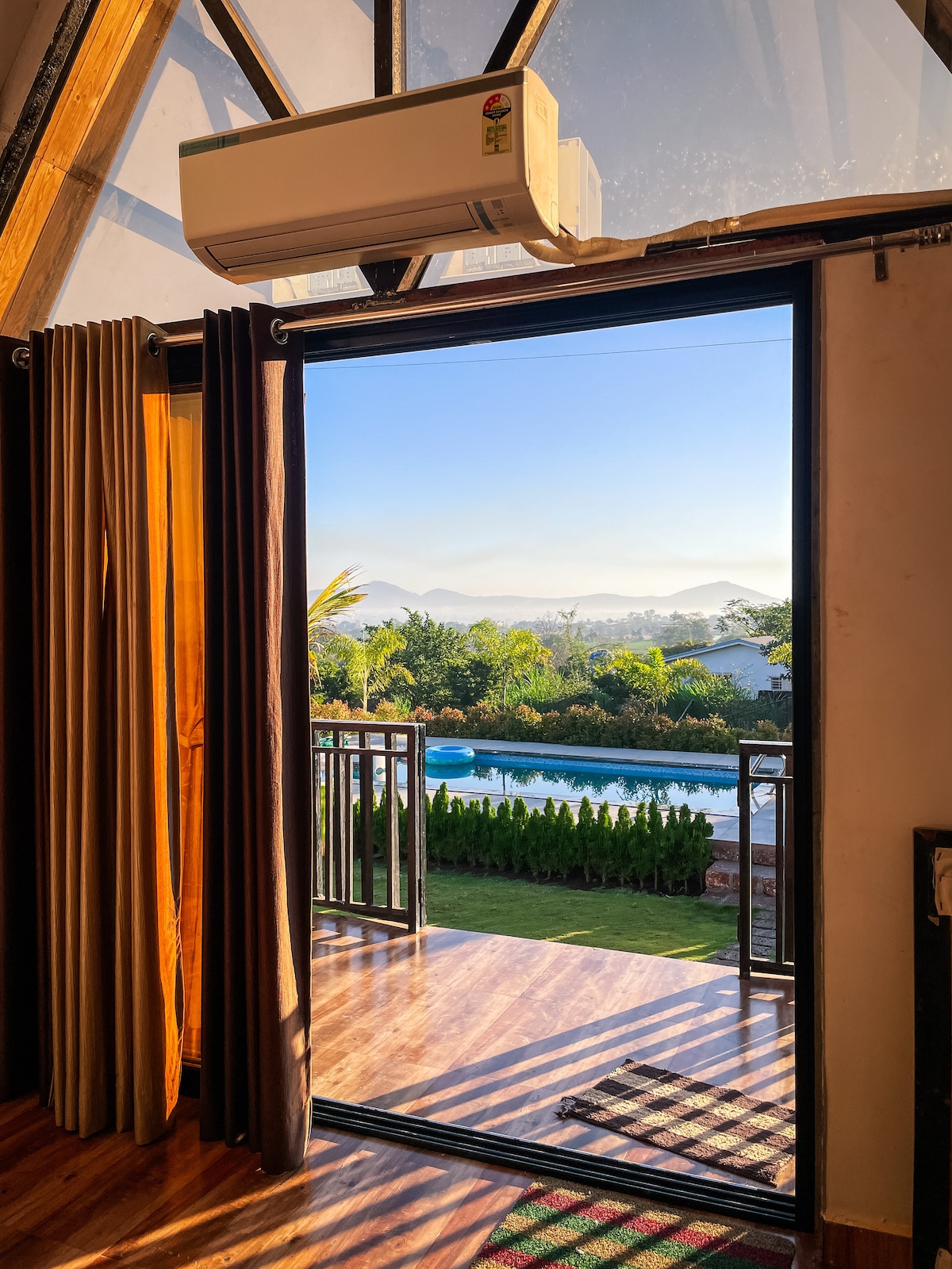 Hosted by Privy Stays Alibaug’s most trusted host network with 5,000+ reviews and a 4.8⭐ rating. Welcome to our luxurious rooftop wooden cabin suite, featuring a private pool, bathtub, AC room, and attached washroom. Enjoy breathtaking sunsets and our special dining service under the stars with your loved one. Please note: the cabin’s unique triangular design makes the interiors cozy and compact, mainly washroom, yet warm, charming, and fully equipped for your comfort.