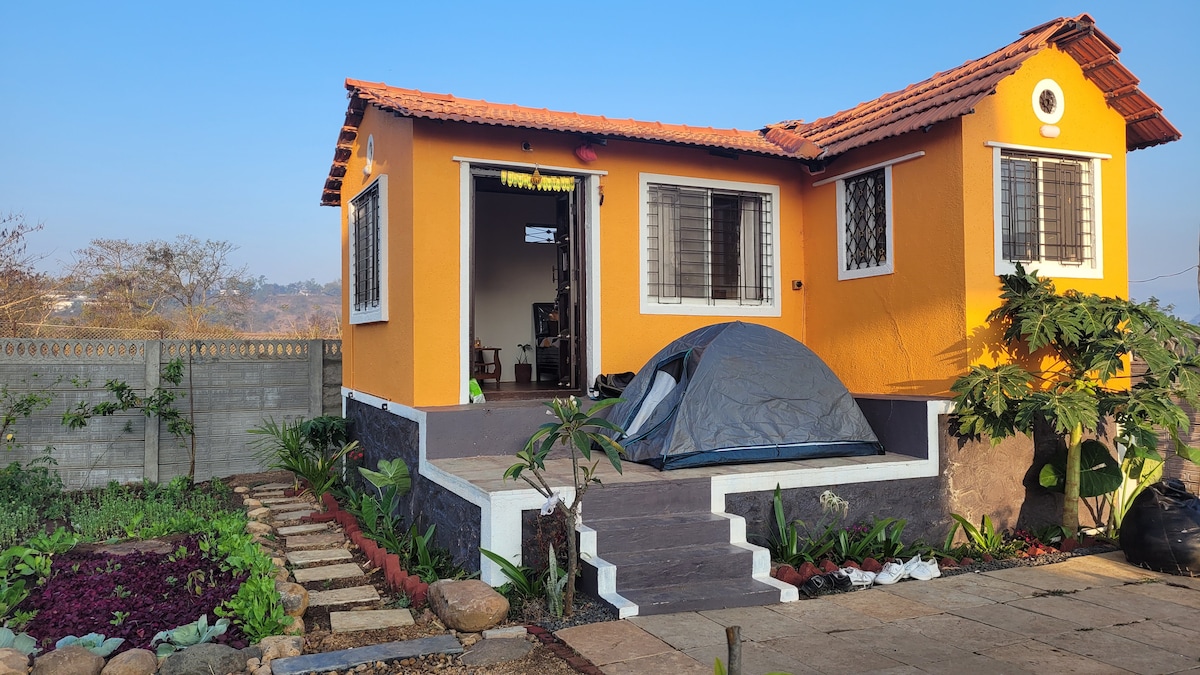 Marigold is the perfect place for relaxation, peacefulness and quality time with loved ones to connect with nature and each other! Experience a raw and rustic organic retreat for all ages and interests. Enjoy tranquility amidst scenic beauty and lush greenery, hills with ample space to harvest and cook organic veggies. Enjoy a cozy bonfire area, bamboo workspace and plenty of open space to hangout. Wake up to stunning views of Sinhagad fort and embrace nature’s simplicity.