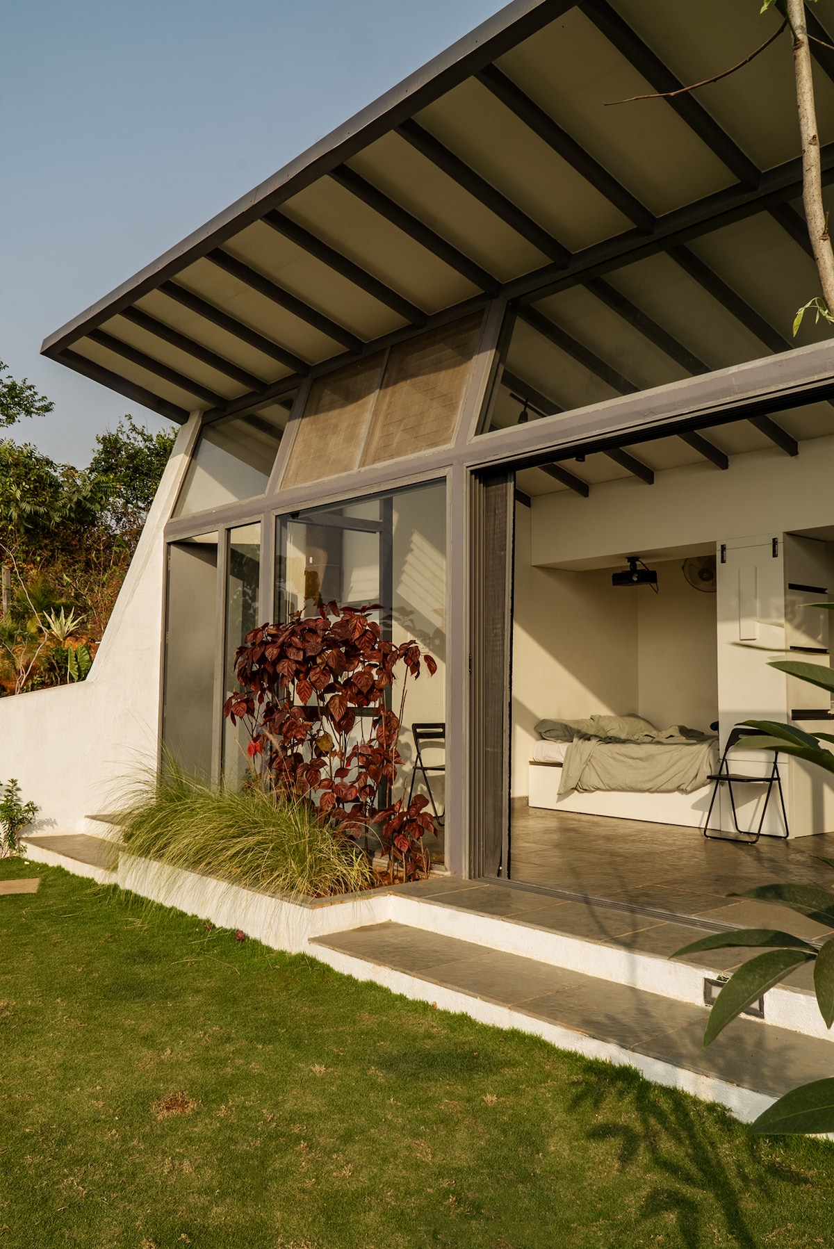 Offer your loved ones a weekend of peace and seclusion at our tiny home surrounded by luscious greens in an 18,000 sqft property on a hillock. Experience the innovative architecture of a modern house that will fulfil all your needs in a tiny footprint! Spend your day in nature, in the various outdoor spaces around the house or the courtyard lawn! After sunset, enjoy a movie night with our built-in projector or the clear night sky with your loved ones!