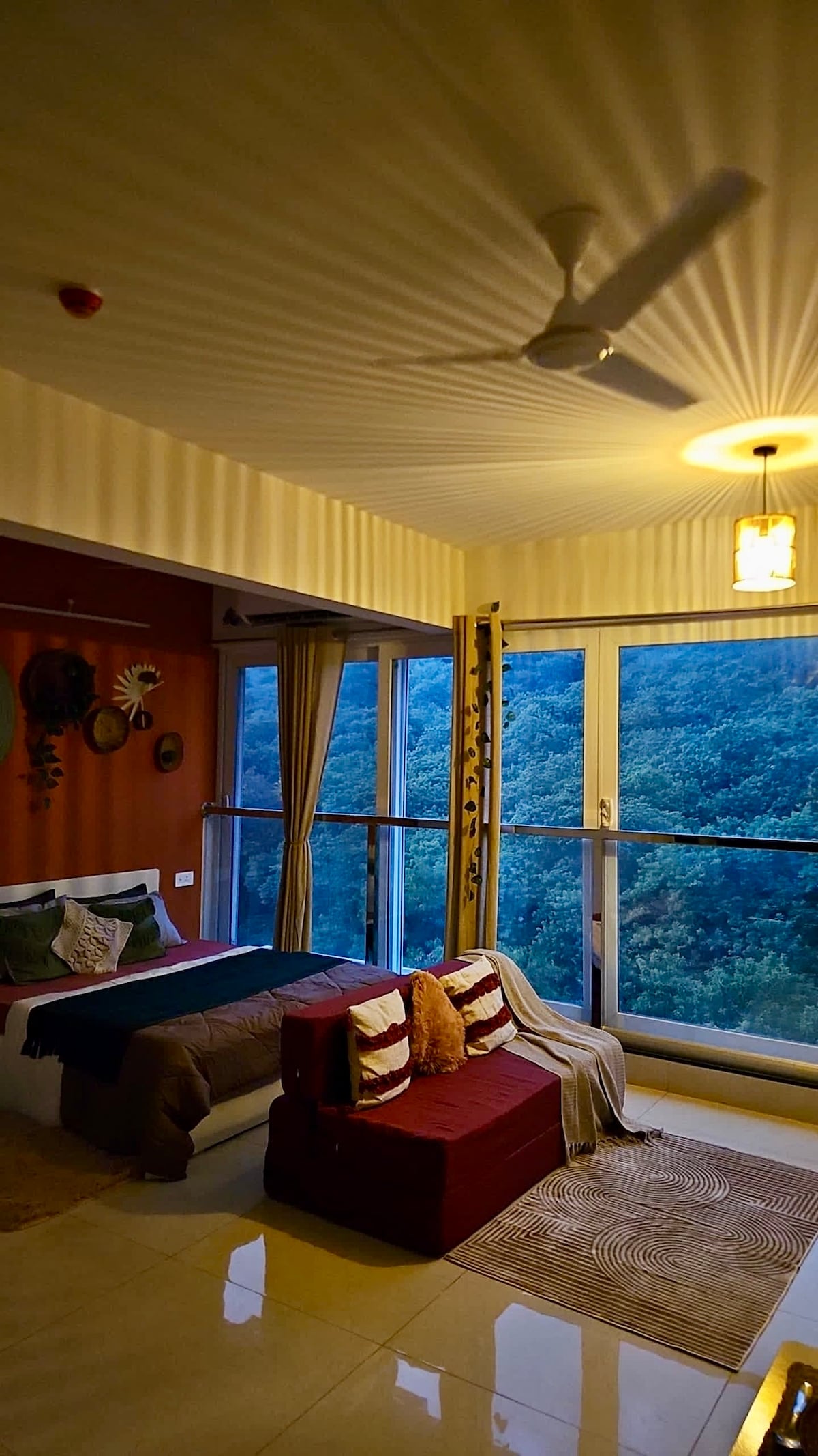 Escape to our Private Riverside Villa & Glass Room in Karjat, where the river is your backyard. Wake up to stunning views from our unique Glass Room separate from the rustic Villa, perched above the water. With direct river access, you can swim, relax, and enjoy nature's serenity. With our 3 bedrooms with attached bathrooms, this private hideaway offers a serene escape for those seeking to immerse themselves in nature's beauty. Glass Room Accommodates: 2-4 Guests Villa Accommodates: 8 Guests