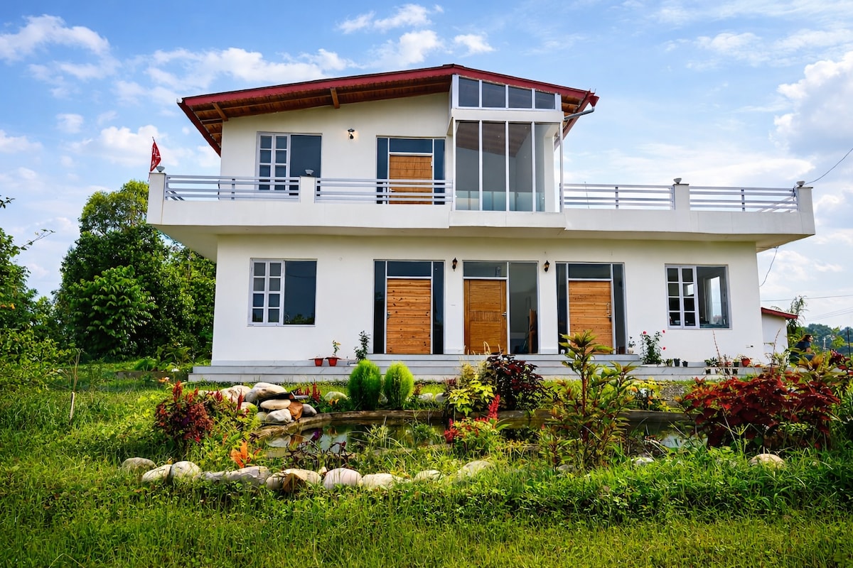 ''Blessing' is a thoughtfully designed artisanal villa in Bhowali, nestled in the foothills of Kumaon on Bhimtal Road, at an altitude of 5600 ft above msl. Full of curated art, cozy nooks, and stunning views. It offers kitchens, car parking with EV charging (3kva Level 1) on payment, and other amenities. Great for a quiet getaway or working remotely in nature. It is ideal for an escape from the city hustle, yet be just 10–20 min from Nainital, Kainchi, Bhimtal, Naukuchiyatal, Sattal & Ramgarh.