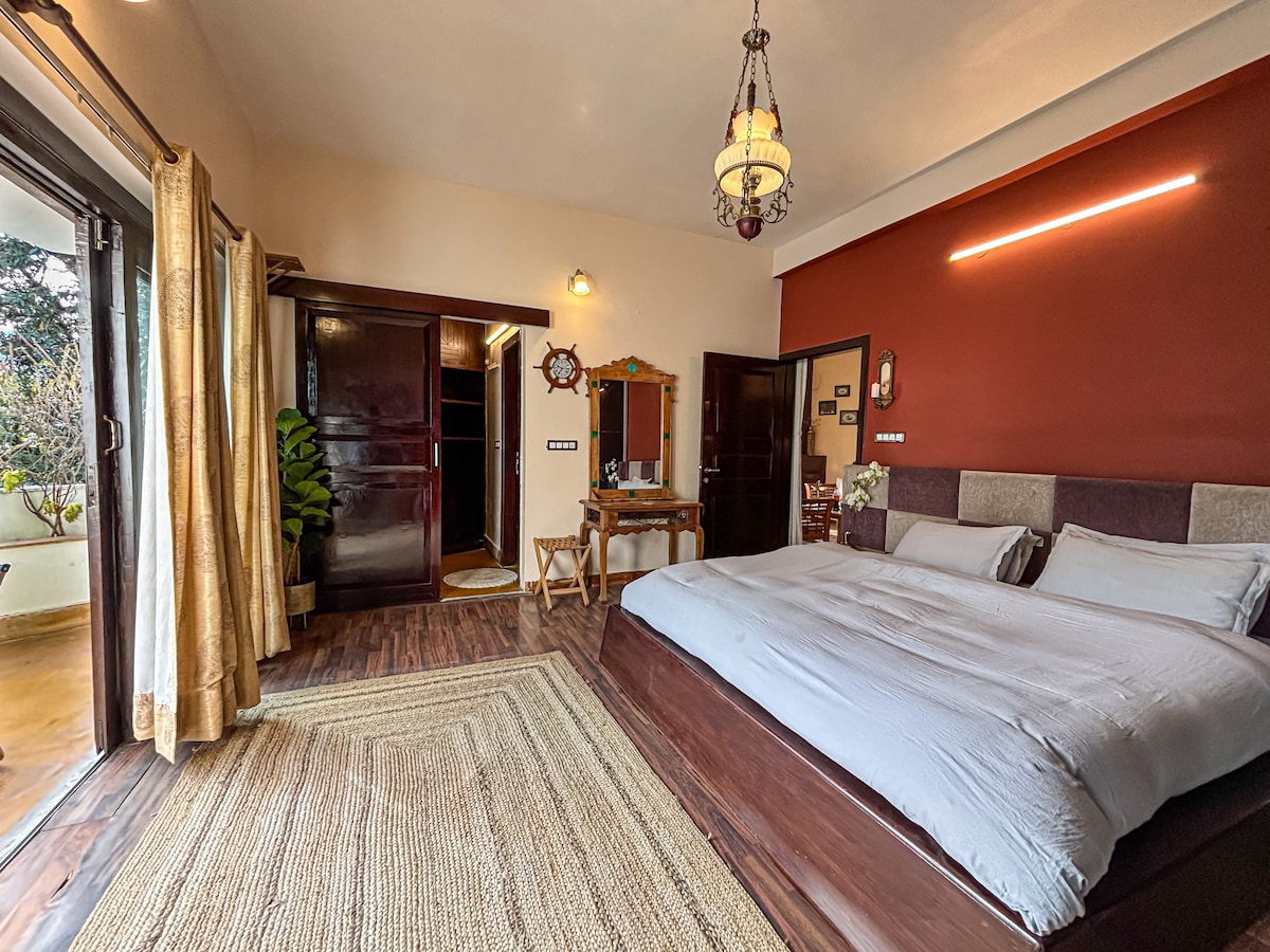 For 2 adults and two kids. A two- storeyed, A shaped Glass- Wood- And- Stone studio villa amidst an Avocado canopy and a small Kiwi vineyard and quite a few rare flower plants in the premise of our ancestral property. Vinatge setting, a fireplace, a freshwater spring, many ponds, a hammock and the constant chirp of birds to keep you company. Ideal for trekkers, readers, bird wacthers, nature lovers, meditation practitioners or people just looking for a quiet spot in a forest.