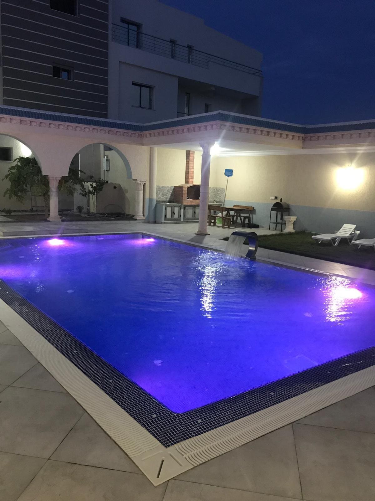 Maison située au rez de chaussée d’un immeuble habité par moi et ma femme au premier étage et sécurisé par un gardien de l’autre côté . La maison possède tout les moyens de confort toutes les chambres sont climatisées bien équipées. La piscine est réservée que pour les locataires de cette maison . Nous garantissant le calme ,la tranquillité et la sécurité. La plage est à 10 min à pieds .