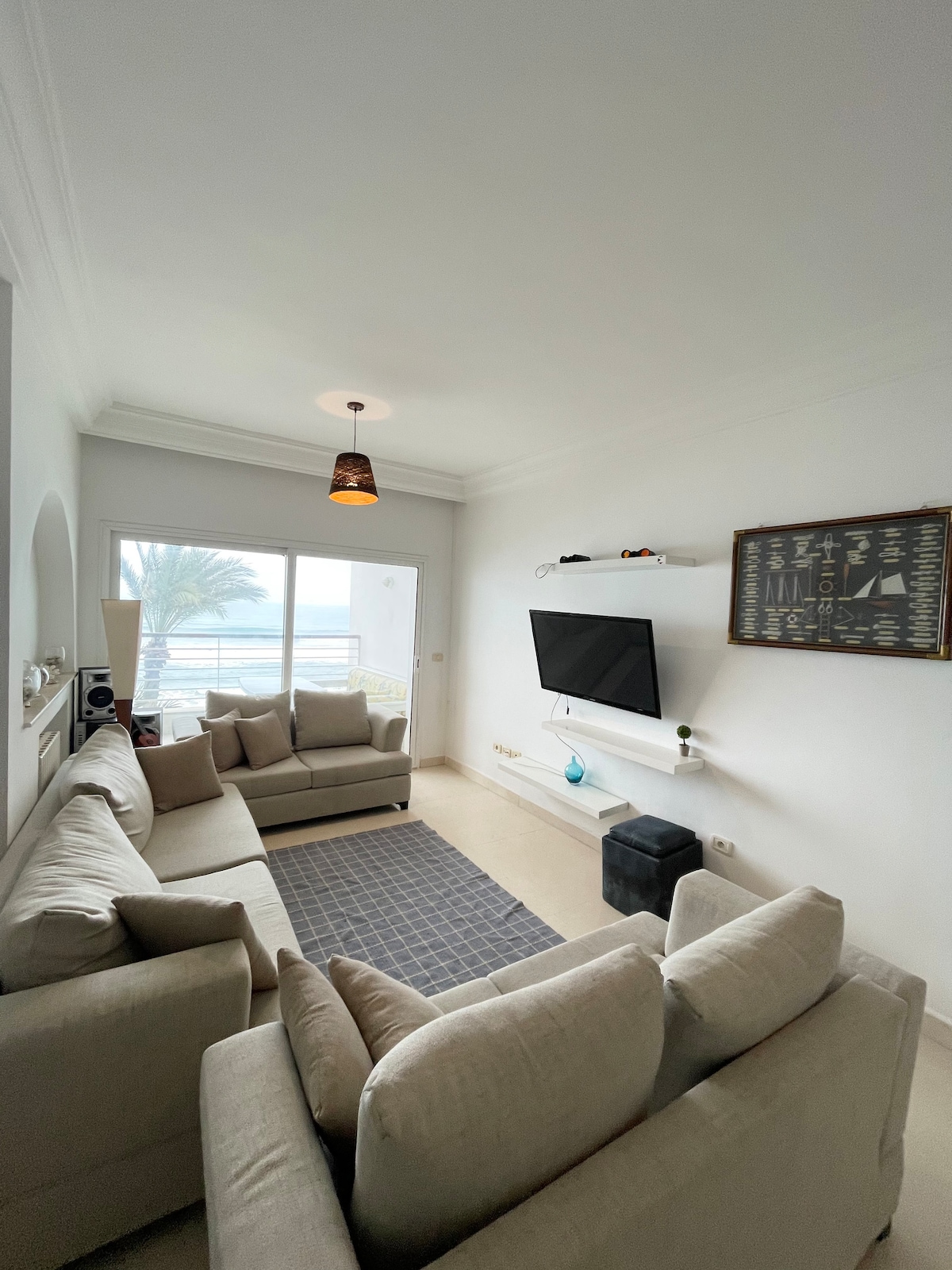 Appartement au 3ème étage (avec ascenseur) avec vue directe sur la mer. Cet appartement dispose d'une suite parentale, une 2ème chambre, un séjour, une cuisine et d'une salle de douche. A 100m de la plage, l'appartement est situé au calme à mi-chemin entre le centre ville de Mahdia et la zone touristique (2 km), il est proche de différents commerces (kiosque, salon de thé, boutiques...).