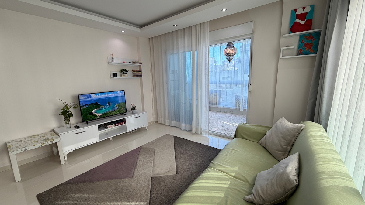 "Officially Licensed for short-term rental" Welcome to the Beach Haven, your relaxing vacation getaway place. This luxurious sea-view apartment lives directly on the coastline of Alanya -Outdoor pool ✔ -Indoor heated pool ✔ -Kids area ✔ -Garden ✔ -Turkish Hammam and Sauna ✔ -Gym ✔ -Private tunnel Beach access with sunbeds and umbrellas ✔ -TV, WIFI ✔ -24 hours security ✔ -Zero meters to the beach ✔ -Sea and mountain views ✔