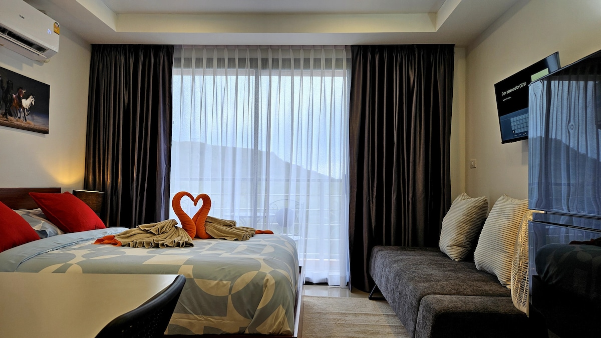 Студия площадью 25м² на 7 этаже с видом на рассвет, горы и зелёный сад. От комплекса 777 до пляжа Майкао 1км. Студия укомплектована полноценной кухней, есть стиральная машина, раскладной диван, кровать 5футов, кондиционер, тв, балкон, свой санузел, интернет. Дополнительно оплачивается вода и электричество по счетчикам и плюс возвратный депозит 3000бат возьмёт ресепшн.
