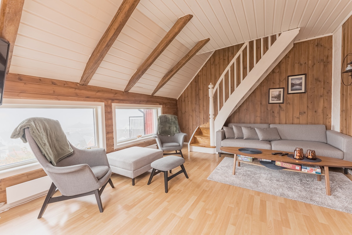 Discover our stylish attic apartment in the heart of Lillehammer! This unique retreat, perfect for up to 6 guests, is flooded with natural light and features a sunny balcony with stunning views. With 3 queen bedrooms, a full kitchen, and good parking, it's the ideal base for exploring the city. Enjoy a quiet, central location just steps from the main pedestrian street.