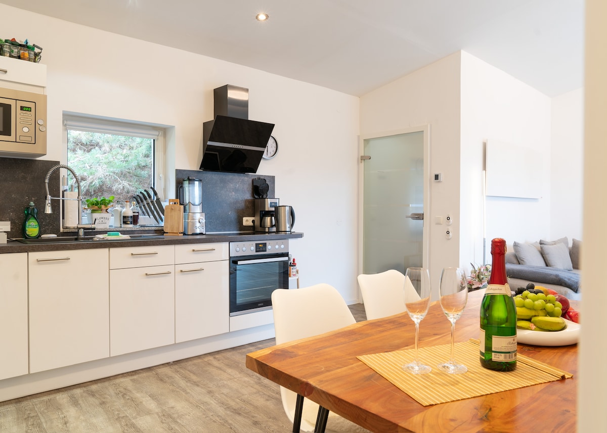Experience a special holiday in an ecologically built wooden house in a peaceful location on the edge of a field. The natural construction, stylish ambiance, and proximity to the lake make this accommodation an ideal place for anyone who wants to combine relaxation, comfort, and nature. Here you'll enjoy bright, quiet, and high-quality living spaces with plenty of room and a relaxed atmosphere. Perfect for a short break, a longer stay, or as a stylish base in the Rhine-Neckar region.