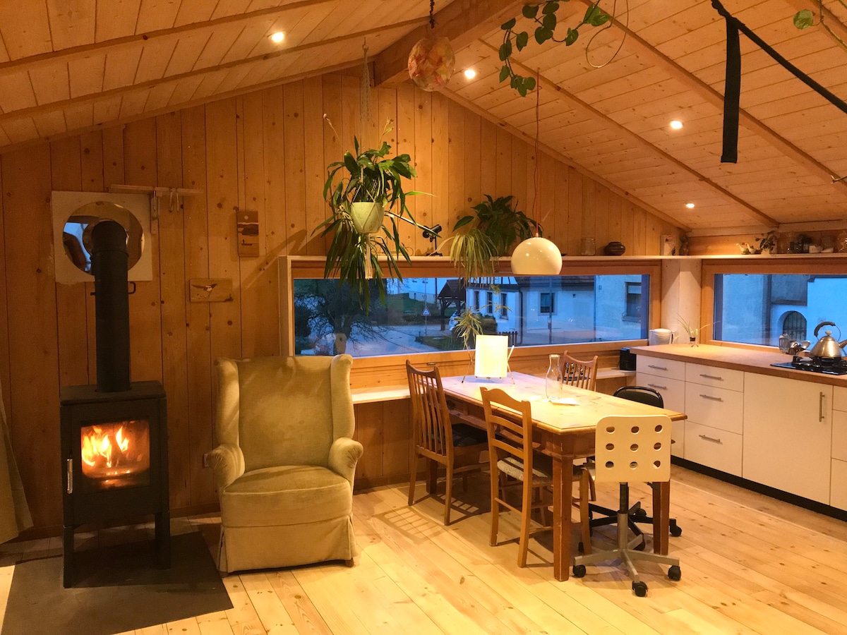 Im kleinen Holzhaus umgeben von Fachwerkhäusern in der ruhigen Dorfmitte kannst du entspannen und die Natur der nahegelegenen Fränkischen Schweiz genießen. Die loftartige ökologische Holz-Bauweise macht die Wohnung einzigartig. Geheizt wird mit Holzofen. In Bad und Nebenzimmer gibt es zudem eine Fußbodenheizung. Im blickgeschützten Gartenbereich steht dir eine Sauna, eine Kaltwasserdusche mit Badewanne, Liegen und Essbereich zur Verfügung. Die Umgebung lockt mit zahlreichen Outdooraktivitäten.