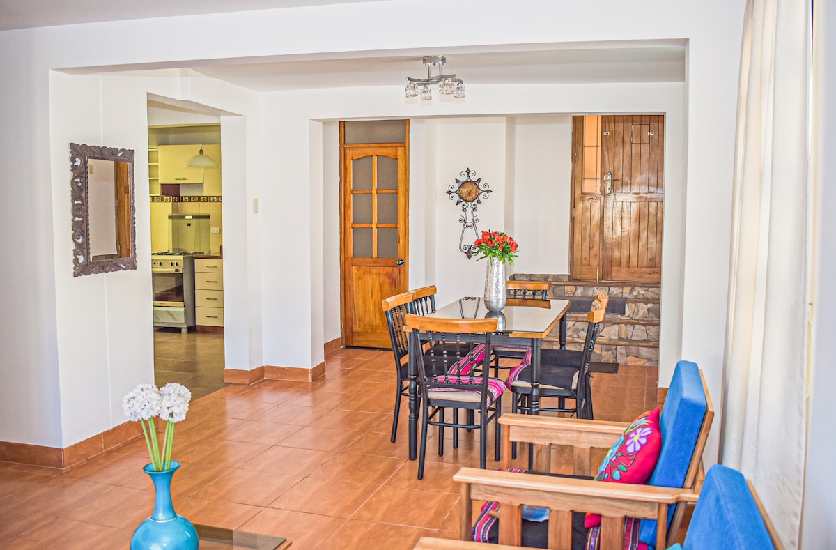 Estimados Huespedes; Bienvenidos a Valentinos House, a 2 minutos caminando de la Plaza de Armas de Huaraz, tienes cerca lugares geniales para comer, pasear, centro comercial y gimnasios, no gastaras nada en transportes El departamento tiene una vista increíble a las montañas y al Parque Cuba, en el segundo piso del edificio, gran lugar para relajarse y desayuna viendo los árboles y Montañas. Cuenta con una sala amplia, cocina equipada, patio, agua caliente, TV65", Internet de alta velocidad