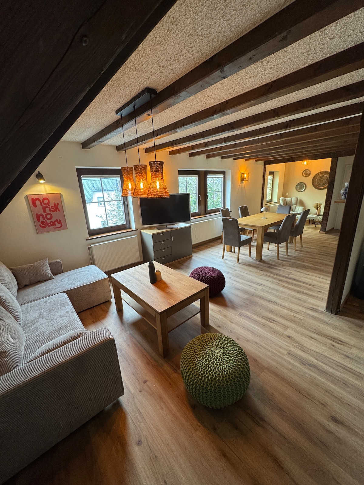Charming two-bedroom apartment in the historic center of Hofheim-Lorsbach for up to 5 guests. The perfect retreat for exploring Lorsbach's picturesque half-timbered houses, hiking in the Taunus mountains, or taking a trip to Frankfurt (approx. 25 minutes by train to the main station). The apartment features high-quality box-spring beds, a living room with a large, fully equipped kitchen, a spacious bathroom, a private terrace, fast Wi-Fi, and private parking in the courtyard.