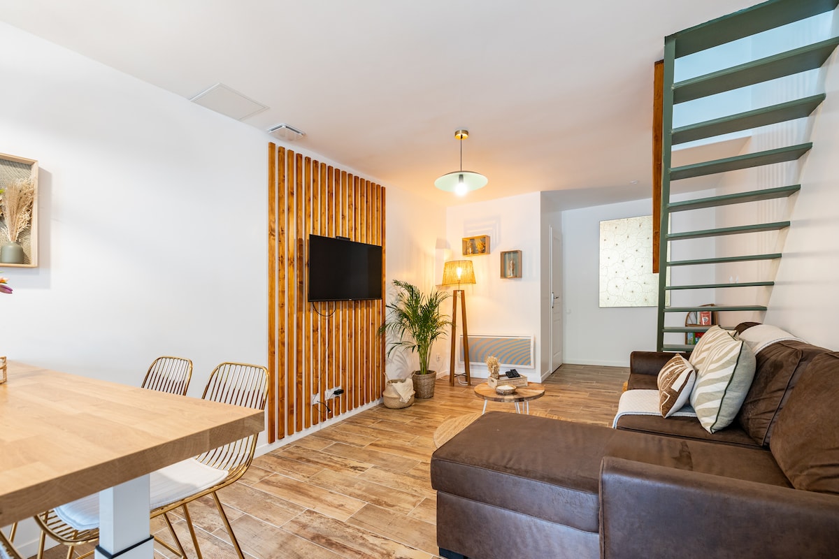 ✨ Découvrez le Mirage Tropical , une parenthèse raffinée au bord de la Loire 🌴. Profitez d’un Spa , Table de Massage d’une terrasse élégante et d’un espace jungle dépaysant pour vous évader. Amusez-vous autour du jeu de fléchettes, partagez un apéro exotique ou détendez-vous dans une atmosphère unique. Le soir venu, la chambre s’illumine de couleurs envoûtantes pour un moment chic et romantique 💖. Ici, chaque détail sublime votre séjour pour créer des souvenirs mémorables.🌴❤️❤️💕💕💕👄🫂❤️