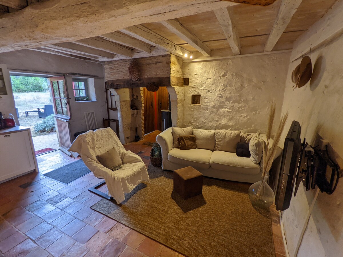 "La Blandinière" Maison de charme, entièrement rénovée, 45 m2 Dans un écrin de verdure et au calme. A deux pas de la Loire. A l'étage une chambre avec un grand lit, salle de bain, WC. En rez-de-chaussée, une pièce avec le charme des maisons anciennes comprenant un espace cuisine, salon avec canapé, table, télé, wifi. Barbecue, salon de jardin, transats, vélos. A proximité : golf, randonnée pédestre et équestre , visites de caves, canoë, marchés , pêche, VTT, musées, châteaux.