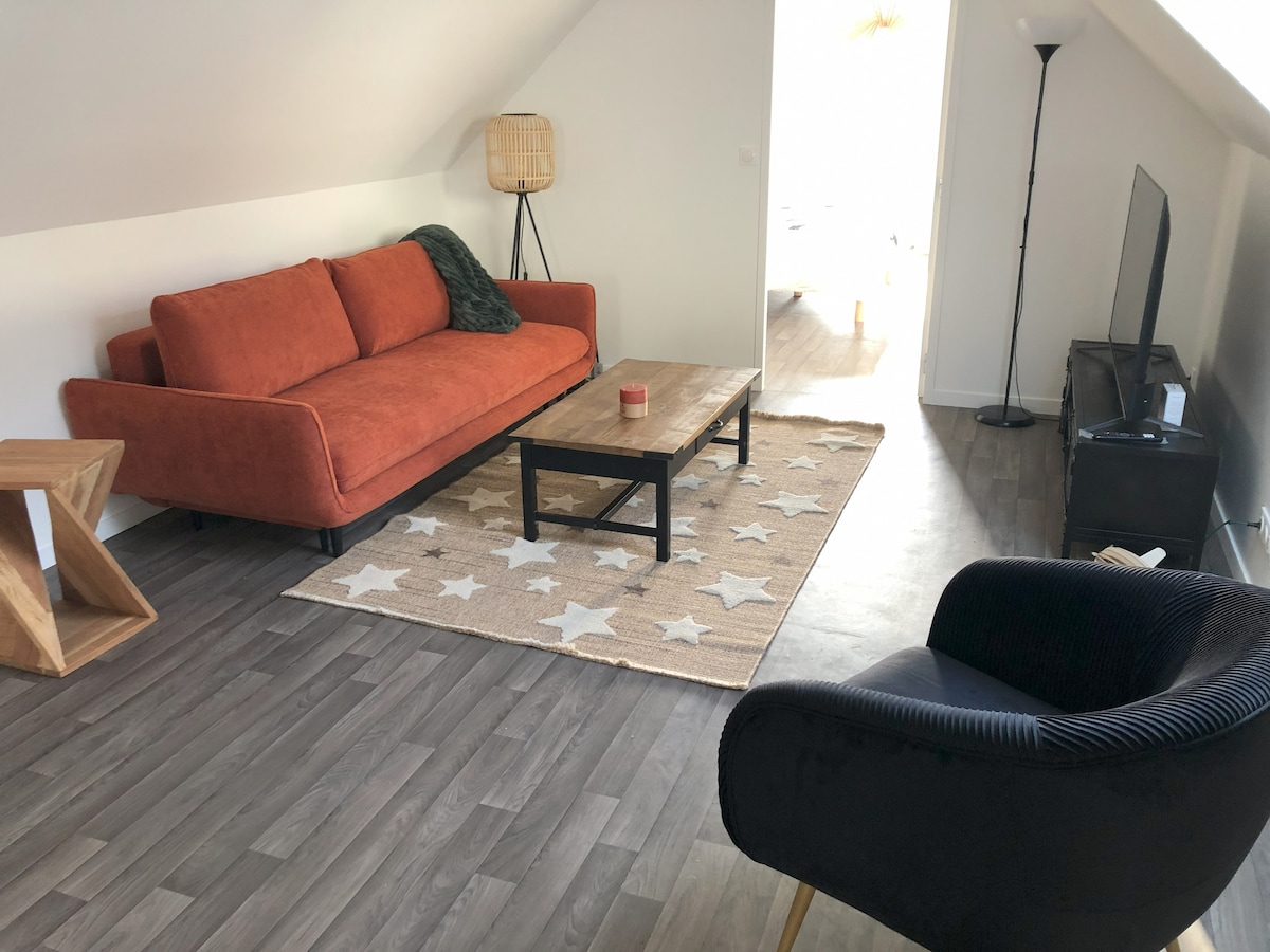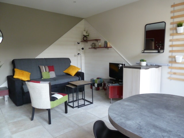 Pièce meublée de 25 m2 cuisine aménagée (réfrigérateur, four combiné : micro-ondes + traditionnel, plaques induction, hotte). Table + 4 chaises. Écran plat. WiFi. Lit de 160 cm, matelas épais, lit fait à votre arrivée. Douche, lavabo, sèche-serviettes, sèche-cheveux. WC séparés. Placard/penderie. Nombreux rangements. Terrasse avec mobilier de jardin. Suite à plusieurs déconvenues, nous précisons que le ménage doit être effectué à vôtre départ. Non-fumeur ou à l'extérieur.