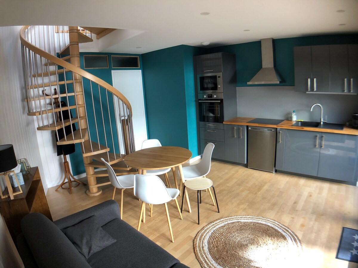 Newly renovated apartment with an allocated parking area within an enclosed garden. Terrasse with table, chairs and electric plancha. Industrial designed studio equipped with a quality sofa-bed. 42" television with access to Netflix. Full fridge freezer. Please note that the extra fee of 25€ includes, quality bedding, towels (2 per person), tea towels and the final cleaning. Please don't hesitate getting in touch with us if you have any questions. Kind regards, Karolyn and Pascal