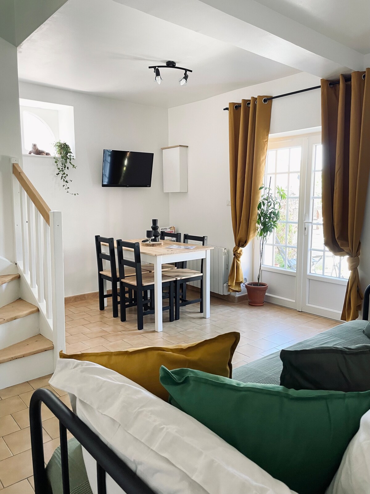 Au calme dans notre jardin, dépendance en "schiste" pierre typique de la région Angevine Au cœur du bourg, idéalement situé à proximité des bords de Loire, des vignes, des commerces et services de proximités : Supérette, boulangerie, fleuriste, esthéticienne, tabac-presse, poste, médecins, dentiste… En voiture : Angers, 15 mn Saumur, 40 mn Puy du Fou, 50 mn Places de parking gratuites sur la Grand' Rue Pour les cyclistes, possibilité de mettre les vélos à l'abri Propriétaires sur place