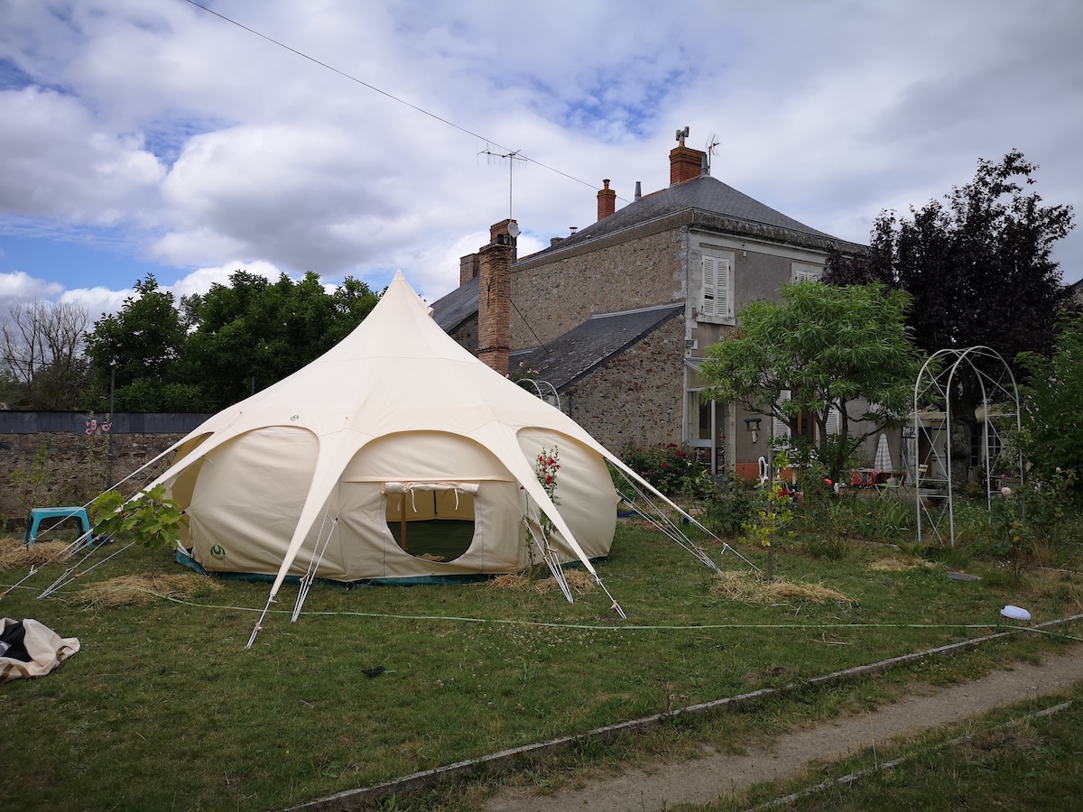A lodge version "Out of Time" in Anjou in a "glamping chic" spirit In the heart of a 10 hectare estate near an 18th century mansion, a safari tent awaits you. With its wooden structure, it offers an unusual style with a careful decoration of antique objects. The outbuilding, for your personal use, has sanitary facilities and a kitchen. The whole guarantees you comfort and tranquility. Come and recharge your batteries in the countryside in a privileged, secure and timeless natural setting!