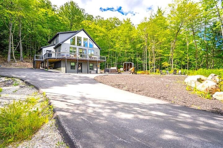 Three Peaks Cabin is a one of a kind Beautiful Mountain Home located in tranquil Bryant Pond Maine. Home sits atop peak that has direct views of the White Mountains, Lake Christopher and more as well as a stone throw away from world class skiing at Sunday River & Mt Abram. You'll feel right at home when you walk through the doors of this Bryant Pond vacation rental. The 3-bedroom, 2 -bath chalet-style house features 1625 square feet of beautiful living space complete with tasteful decor, with three large Pella French doors pointing directly west with views of Mt. Abram and Mt. Washington. Overlooking the Lake Christopher and surrounded by trees at the end of a cul-de-sac, this home offers families and groups plenty of outdoor recreation opportunities from boating and watersports to hiking, biking, and skiing! 65" Flat-Screen TV equipped with Dish Network Satellite, w/ Netflix, Prime Video, Dish Multisport w/ NFL Red zone | Gourmet Kitchen | Floor-to-Ceiling Windows From outdoor sports to downtown Bethel's unique shops and restaurants, this upscale retreat is the perfect getaway spot for families and groups! Bedroom 1: Queen Bed | Bedroom 2 Two Twin Beds | Bedroom 3: Two Twin Beds. OUTDOOR LIVING: Full private yard, with beautiful manicured grass and flowers during summer and fall months. Brand new Weber Gas grill, well designed fire pit with new Adirondack chairs & lovely outdoor sitting area with tables and chairs to sit and enjoy the view of the white mountains. INDOOR LIVING: 2 flat-screen TVs w/ streaming capabilities, Floor to ceiling fireplace which accompanies a large sectional couch to cozy up on the cool Maine nights next to the fireplace. dining table which sit four. The beautiful Gourmet Kitchen comes with stainless steel commercial gas range, Large stainless steel Refrigerator stocked with fresh neighboring Poland Spring waters, Stainless steel Dishwasher as well as an island where two additional seats are available. The downstairs bathroom also comes with a jacuzzi bath tub ready to relax the night away after a long day of enjoying western Maine festivities. KITCHEN: Fully equipped, drip coffee maker, keurig coffee & latte maker, toaster, cooking utensils, cutlery, spices, stainless steel appliances, dishware & flatware, breakfast bar GENERAL: Free Wi-Fi, central heat, central a/c, ceiling fans, towels/linens, complimentary toiletries such as Shampoo, Conditioner, Body Wash, Lotion, Goat Milk Soaps etc. & washer/dryer FAQ: Pet fee (paid pre-trip), stairs required for access PARKING: Driveway (4 vehicles) Three Peaks Cabin is located at 110 Yawkey Way, Bryant Pond, Maine. The home is located on a private street maintained by our HOA association. There are 6 total houses which included "Three Peaks Cabin". The property is located all the way up a steep paved road, last house on the right at the end of the culdesac.