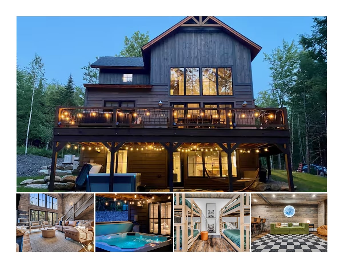 Relax at this off-grid modern A-Frame cabin on 90 acres in Maine's Lakes Region. The cabin is tucked deep in the woods, far away from everything. 4 kayaks and firewood included. Separate bunk cabin increases sleeping capacity to 10 Wood-Fired Cedar Hot Tub - a relaxing, very unique experience 5+ lakes nearby- excellent swimming and kayaking Cedar throughout cabin, concrete countertops, cedar/concrete shower. Outdoor firepit. Hiking trails. Beaver Pond. Property has private airstrip (51ME)