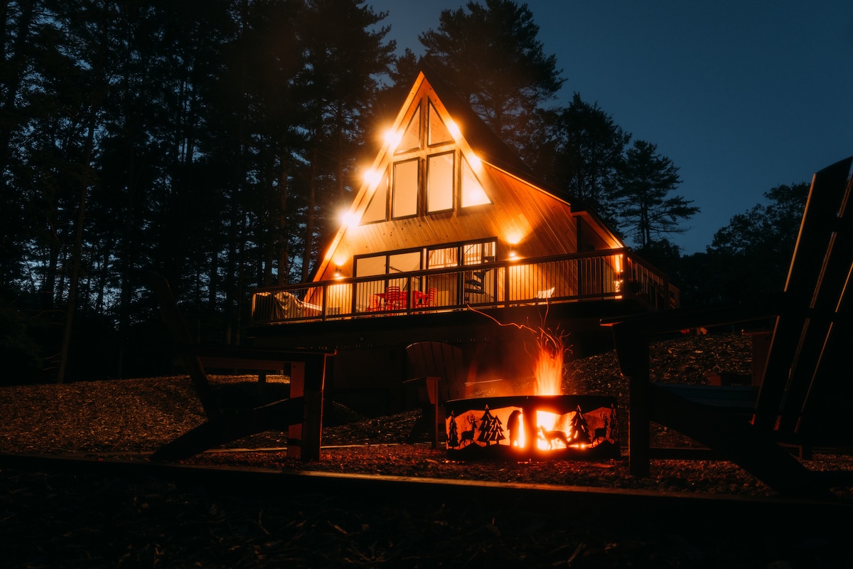 • Perfect for small families or couples, our signature A-Frame cabin features a modern interior gas burning fireplace, soaring ceilings, huge windows, stylish interiors, and all the comforts of home. • This cozy 1,100 square foot space comfortably accommodates up to four guests in two bedrooms (one with a King-size bed and the other with a Queen-size bed) and a shared bathroom. • 7 minute drive to downtown Freeport. • Proud to be ranked in the top 1% and voted Guest Favorite!