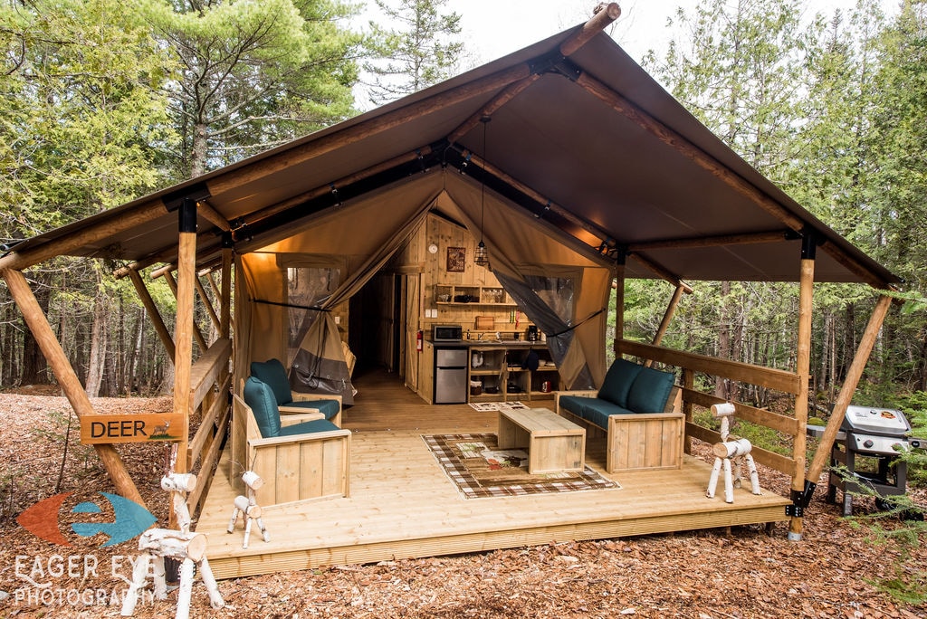4 miles from Acadia. Relax, re-charge! Our tents have all the comforts of home. Linens, towels, bath products and kitchen supplies. Just 4 miles from Acadia N.P. This tent has a full bathroom, 2 queen beds, a bunk bed, kitchenette, kitchen table and outside deck. There is a communal fire pit with free wood. We have boardgames and outside games the family can enjoy. Check out the Woods of Eden Glampground in Bar Harbor.