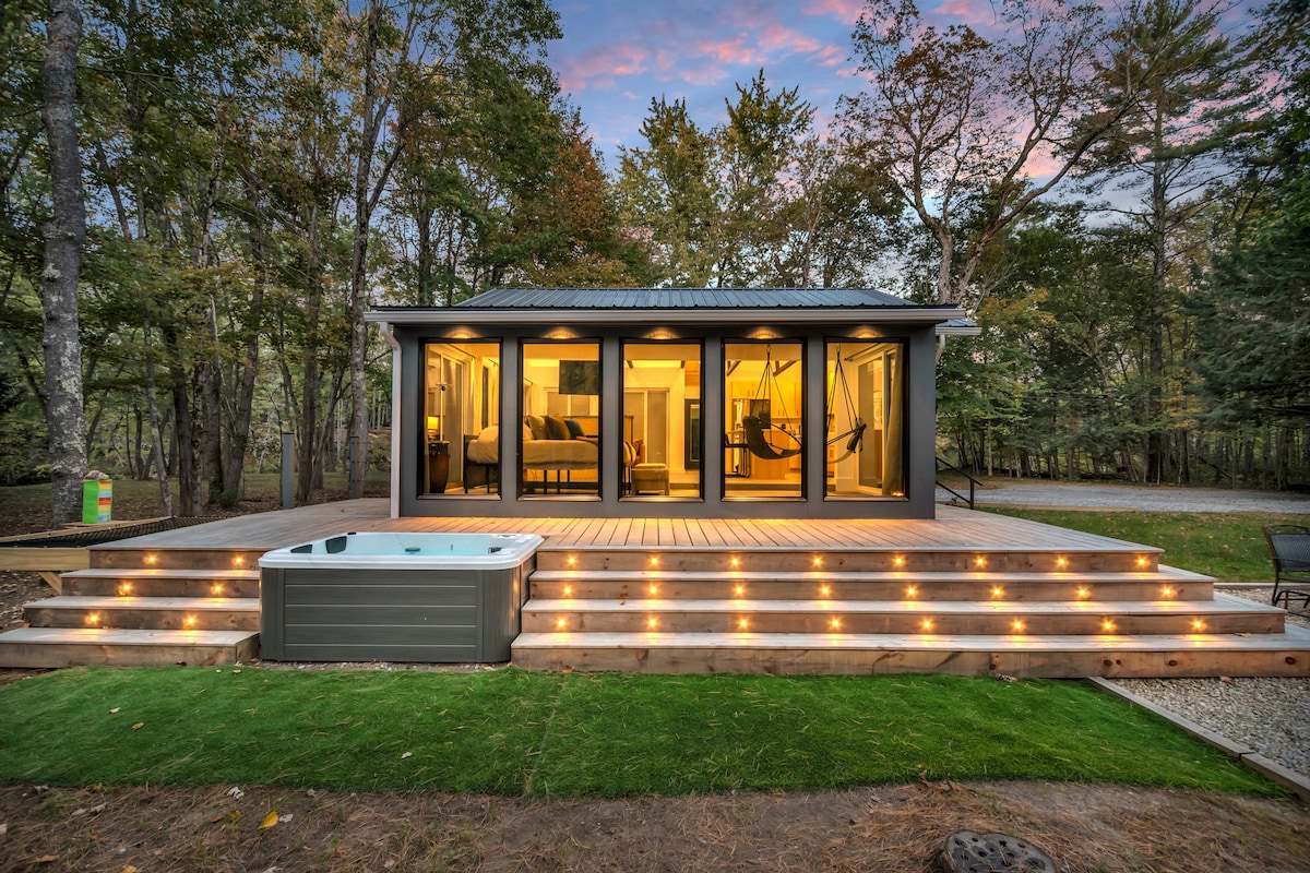 Stay at Hidden Pines Cabins. Modern cabin tucked privately in the forest. Loaded with modern amenities make it perfect for a romantic getaway. Unwind in the hot tub looking up at the sky full of stars. Take a Sauna while being surrounded by nature all around. Relax by the fire pit. Located in the majestic forest of mount agamenticus, the extensive trail system is off our road. Short drive to the Ogunquit/ york beaches, outlets at Kittery and near Portsmouth, Dover and Portland restaurant scenes.