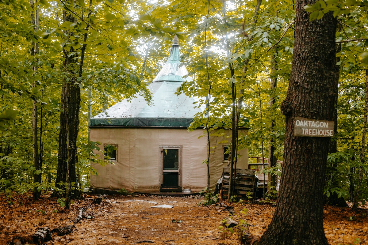 The Oaktagon Tree House is what happens when you decide to live with the forest instead of just visiting it. Built around a living red oak (her name is Annie), this octagonal tree house invites you up into the canopy, where birds provide the soundtrack and the lake glimmers below. Perched on a 14-acre island just a half-mile from shore, it’s a place to slow down, look outward through leaves and branches, and remember what it feels like to be held by trees.