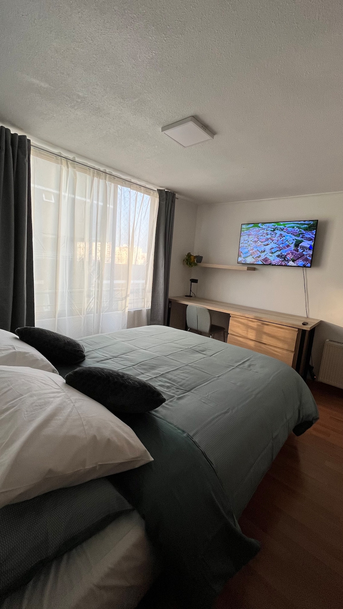 Moderno y acogedor departamento con aire acondicionado en el corazón de Santiago. A pasos del metro y del Centro Histórico, rodeado de museos, mercados y restaurantes. Cama king, cocina equipada, balcón y wifi rápido, ideal para viajes o estadías largas. Edificio seguro con conserje 24/7. Atención personalizada, check-in flexible y recomendaciones locales para que disfrutes la ciudad como un residente, con comodidad y tranquilidad.